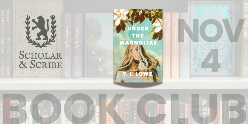 Our Christian fiction selection for November is Under the Magnolias by T.I. Lowe. If you haven’t already, please complete the form and be sure to purchase your copy at Scholar & Scribe to read beforehand…and get 10% off when you do!