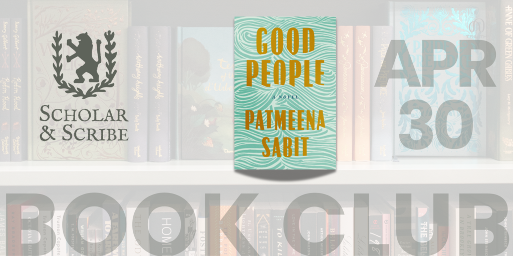 Our fiction selection for April is Good People by Patmeena Sabit. If you haven’t already, please complete the form and be sure to purchase your copy at Scholar & Scribe to read beforehand…and get 10% off when you do!