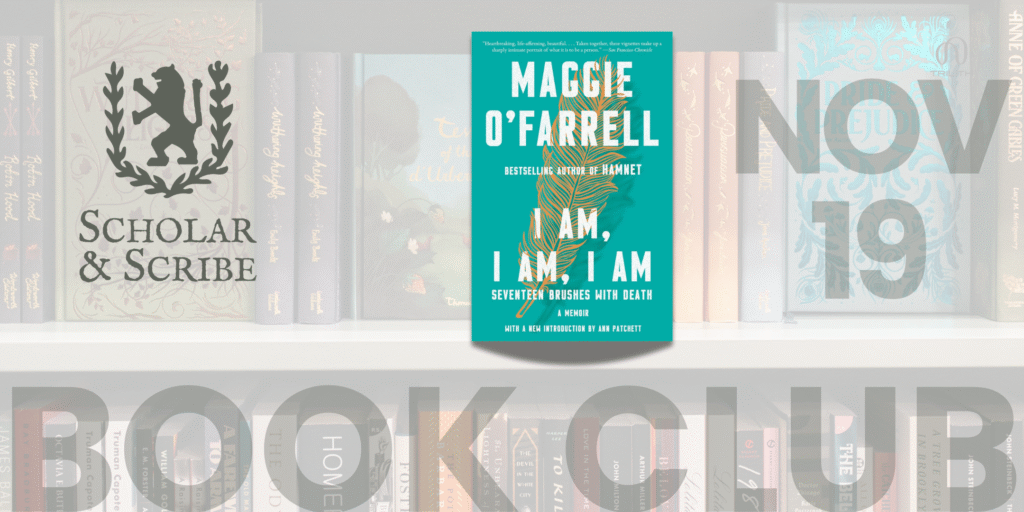 Our memoir selection for November is I Am, I Am, I Am by Maggie O’Farrell. If you haven’t already, please complete the form and be sure to purchase your copy at Scholar & Scribe to read beforehand…and get 10% off when you do!