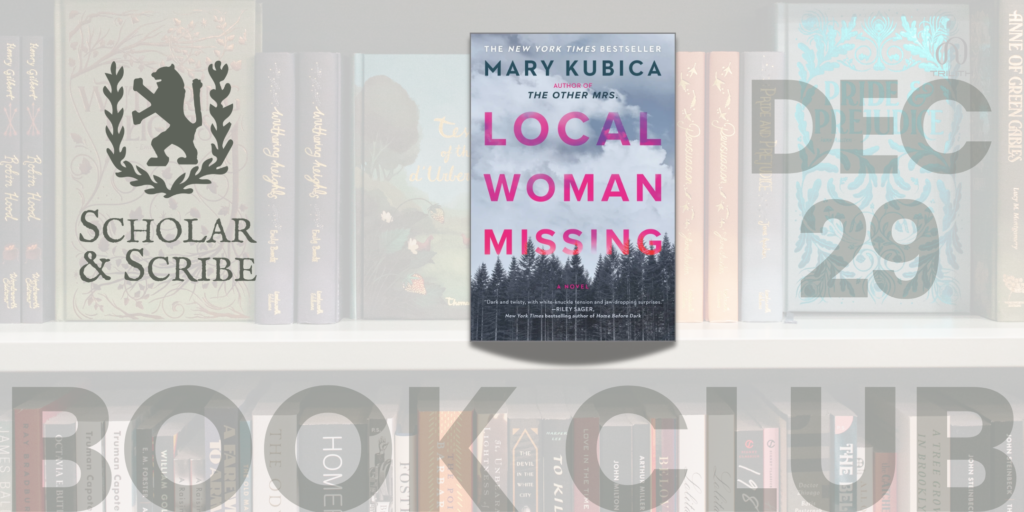 Our mystery selection for December is Local Woman Missing by Mary Kubica. If you haven’t already, please complete the form and be sure to purchase your copy at Scholar & Scribe to read beforehand…and get 10% off when you do!