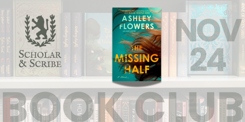 Our mystery selection for November is The Missing Half by Ashley Flowers. If you haven’t already, please complete the form and be sure to purchase your copy at Scholar & Scribe to read beforehand…and get 10% off when you do!