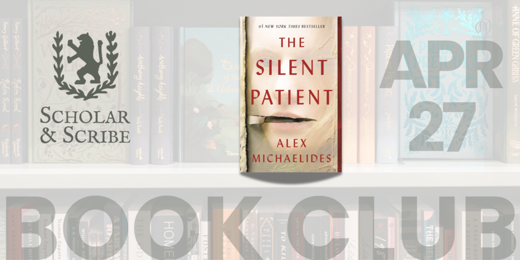 Our mystery selection for April is The Silent Patient by Alex Michaelides. If you haven’t already, please complete the form and be sure to purchase your copy at Scholar & Scribe to read beforehand…and get 10% off when you do!