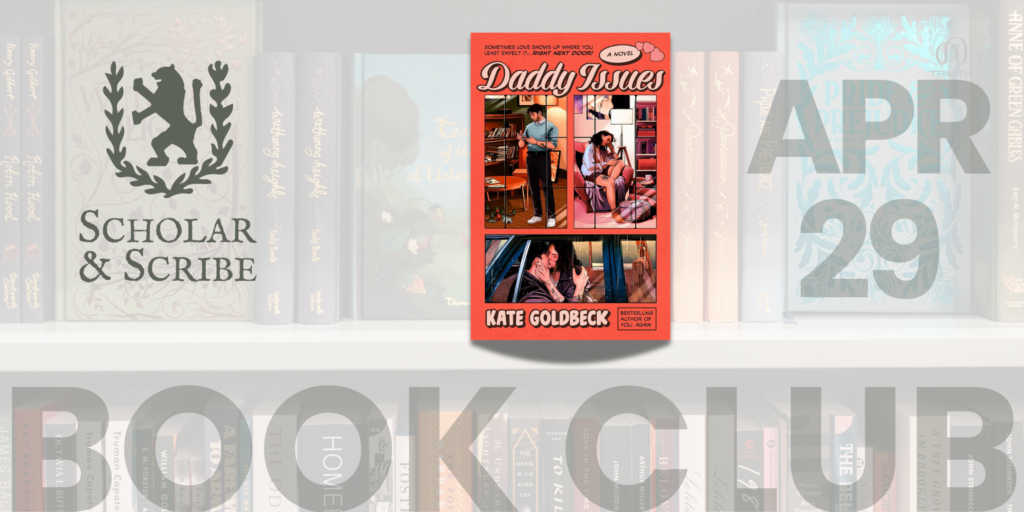 Our romance selection for April is Daddy Issues by Kate Goldbeck. If you haven’t already, please complete the form and be sure to purchase your copy at Scholar & Scribe to read beforehand…and get 10% off when you do!