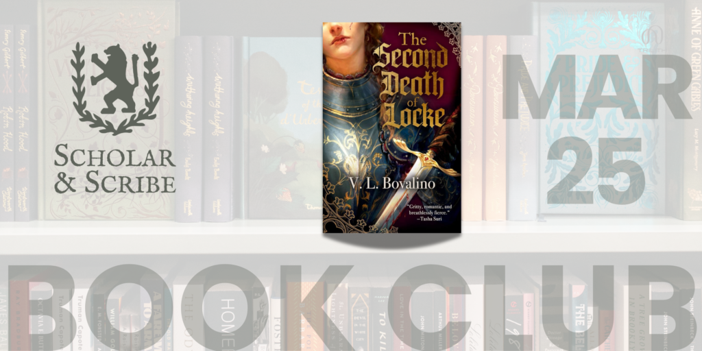 Our romance selection for March is The Second Death of Locke by V.L. Bovalino. If you haven’t already, please complete the form and be sure to purchase your copy at Scholar & Scribe to read beforehand…and get 10% off when you do!
